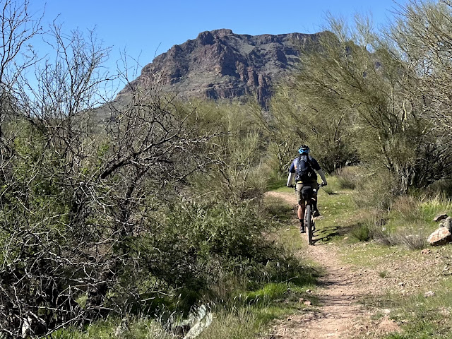 If you haven't ridden this section before, it's probably going to frustrate you. It is tight and technical with some tricky challenge moves thrown in on switchbacks. It is simultaneously difficult and fun in my opinion. I think I enjoy it more each time I ride it, especially in this direction. Just don't expect to make quick progress. You do get some good views of flat iron and some enormous saguaros too. Look around every once in a while and take it in!